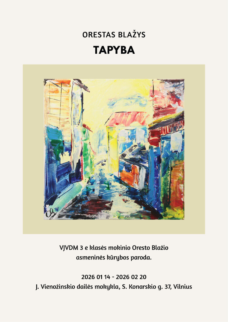 Sausio 14 d. (trečiadienį) 18 val. kviečiame net į dviejų parodų atidarymus Vilniaus Justino Vienožinskio dailės mokykloje. Pirmo aukšto fojė eksponuojami mūsų mokyklos III e klasės mokinio Oresto Blažio savarankiški tapybos darbai. Ekspresyvią, spalvingą tapybą plačiau parodyti paskatino Oresto mokytoja Raminta Šumskytė. O antrojo aukšto erdvėje pristatomi jautrūs, nuotaikingi Nacionalinės M. K. Čiurlionio menų mokyklos 7 d klasės mokinio Liudviko Kavaliausko piešiniai, sukurti namuose iš artimos aplinkos, supančių žmonių bei daiktų. Šią parodą surengti sugalvojome kartu su Liudviko tėvais - žinomais menininkais, restauratoriais Rūta Glinskyte-Kavaliauskiene ir Nerijumi Kavaliausku, taip pat norėdami paskatinti Liudviką ir toliau, greta mokyklos programos, lavinti savo jautrumą, pastabumą ir įtaigų piešinį.